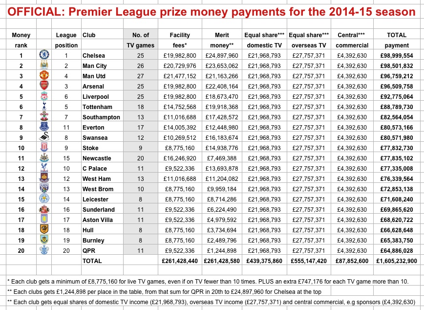 Premier League Value Of Central Payments To Clubs 2020 21